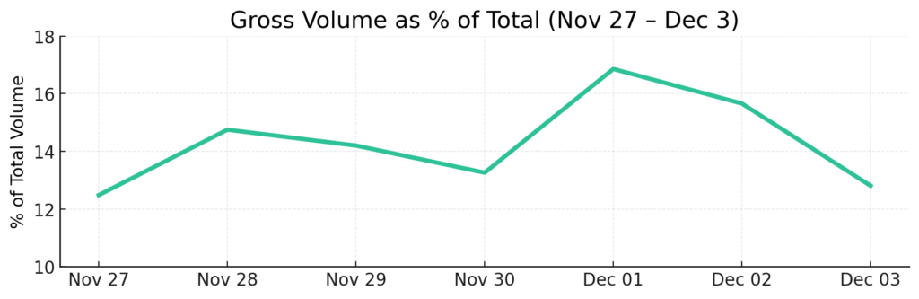 Across November 27 – December 3, ThriveCart vendors processed more than 200,000 transactions. Cyber Monday once again finished as the highest-performing day across the platform, continuing its trend as the peak moment for buyer activity.