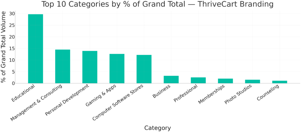 Smaller but consistent contributions from Business Services, Professional Services, Membership Organizations, and Photographic Studios highlight a steadily diversifying merchant base, with more service-driven and niche businesses using ThriveCart to capture high-intent buyers.