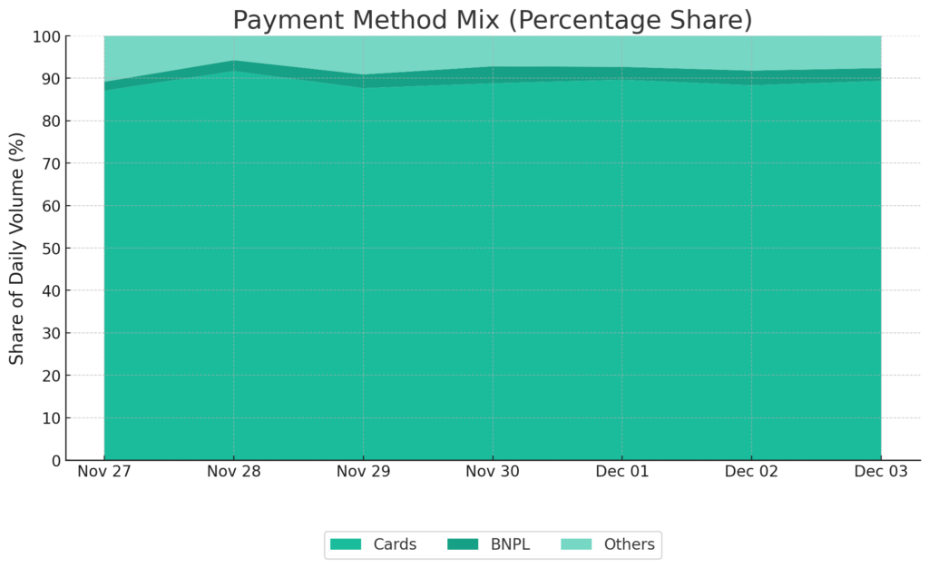 Cards dominated purchasing overall, contributing 89% of gross volume, while BNPL options (Klarna, Affirm, Afterpay) added around 3% of total volume.