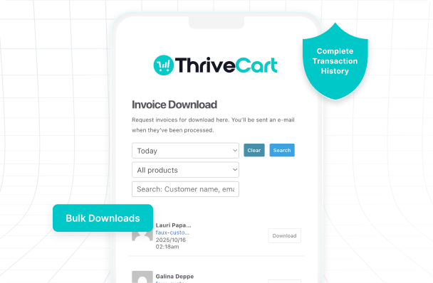 Save hours of admin work with ThriveCart’s Bulk Invoice Downloads. Export invoices in bulk for bookkeeping, client reports, or tax prep — fully formatted and ready to use in seconds.